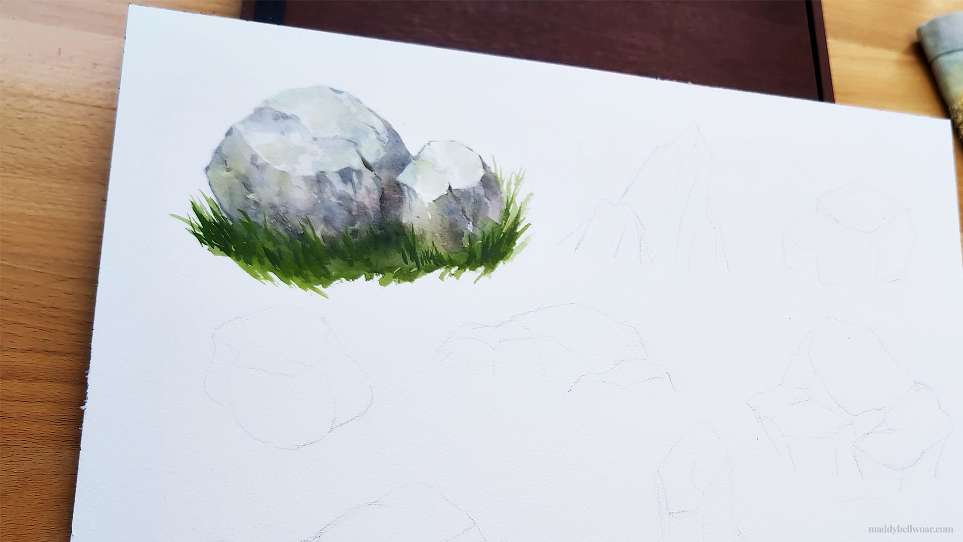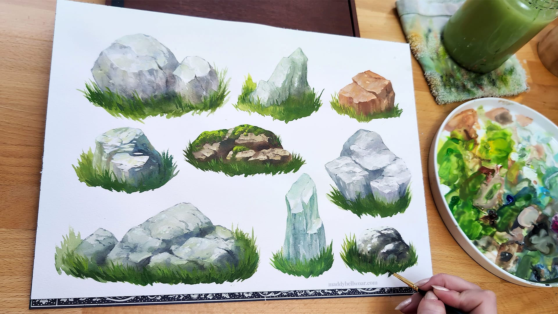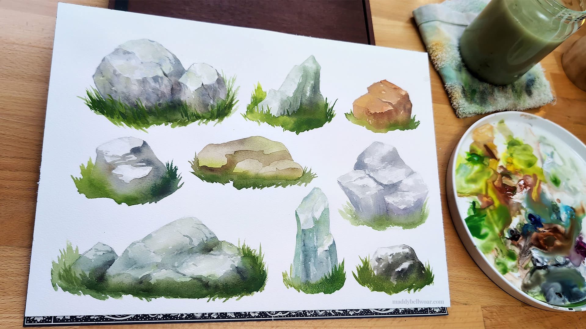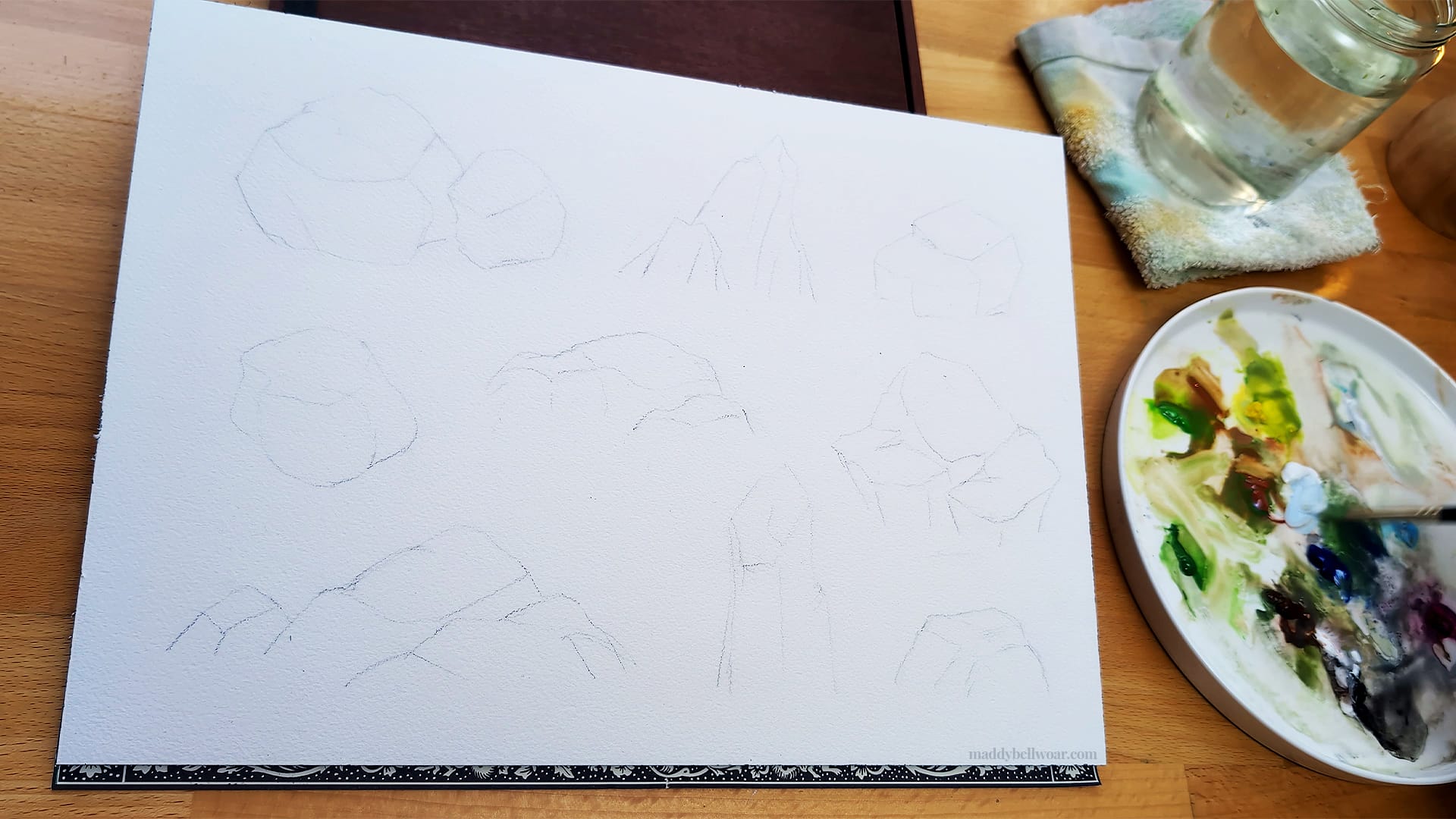 I began the sheet by sketching out a bunch of different rocks in pencil. If you'd like to paint along with the video you're welcome to prepare by sketching out these rock shapes first.