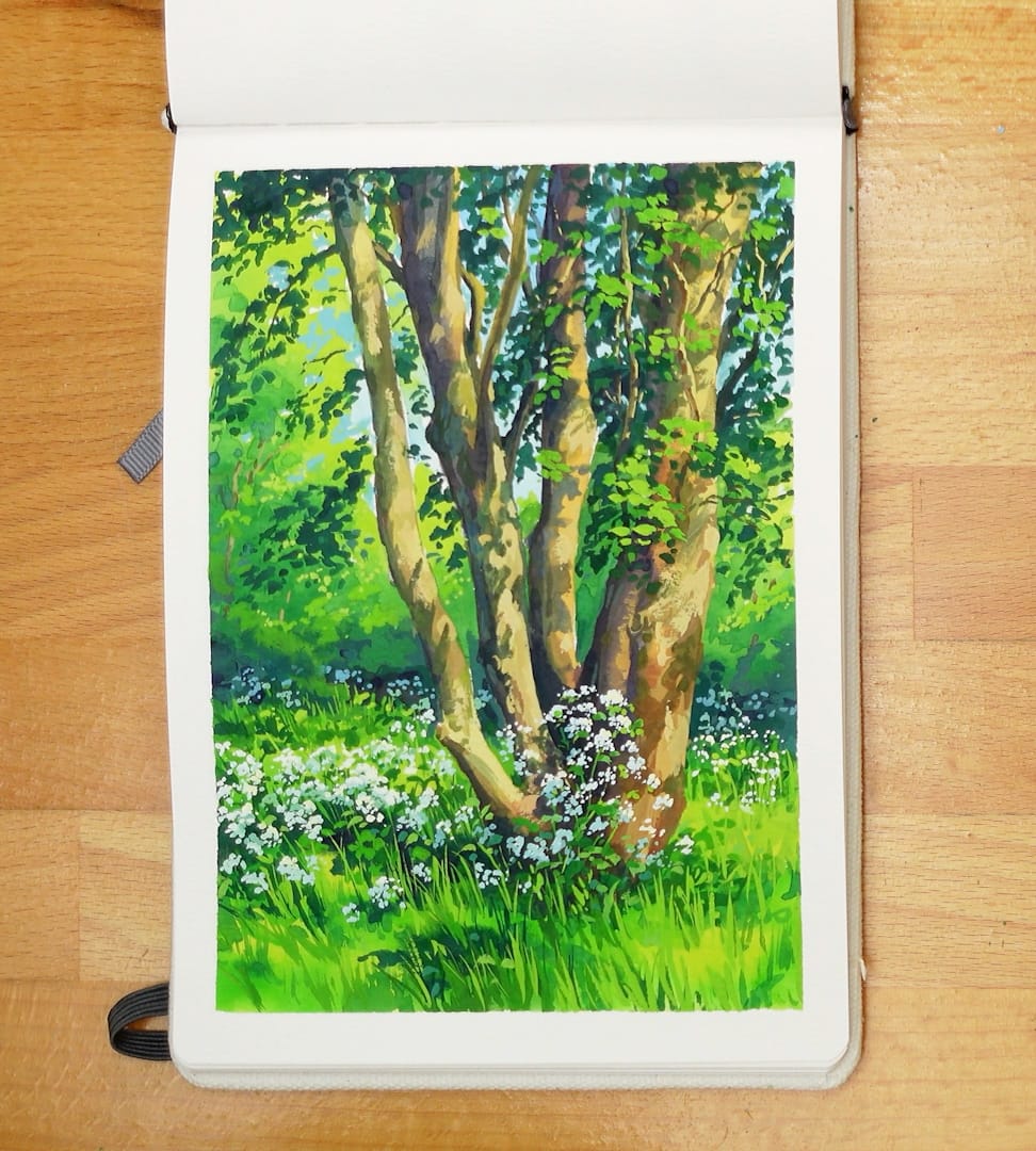After the tree, I moved on to blocking in the grass. I had the same mindset here, allowing the wet paint to blend together on the page and give some soft, textured edges between the shadows and light areas.